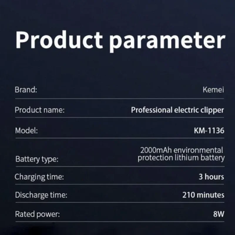 مشخصات کلیدی تکنولوژی اصلاح برش مستقیم یا خطی مشخصات کلی برندکیمی Kemeiکشور مبداچین کشور تولید کننده چین فرم محصول ماشين اصلاح رنگ مشکی مناسب برای اصلاح موهای سر و صورت کاربردقابلیت اصلاح سر و صورت, clipperدارای خاصیتclipperزمان مصرف اصلاح مو و صورت ضد حساسیت ضد آلرژی و التهاب نوع بستهبندی کارتن شرایط نگهداری دور از دسترس کودکان و نور آفتاب، جای خشک و خنک سایر توضیحات از خط زن کیمی میتوان برای اصلاح صورت و خط زنی سر و گردن بهره برد.