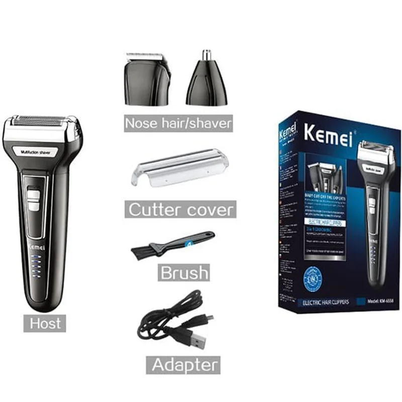 نوع ریش تراش یا ماشین اصلاح:ماشین اصلاح سه کاره شیور، موزن و خط زنجنس تیغه ها: استیل پیشرفته منبع تغذیه: باتری قابل شارژ (بی سیم)سه کاره ریش تراش،موزن بینی،کله موزردارای نمایشگر شارژ باتریشیور دولبه امکان شارژ شدن سریع دارد دارای تیغه های خود تیز شونده تیغه های ماشین اصلاح کیمی از جنس استیل پیشرفته ساخته شده که با خاصیت خودتیز شوندگی که دارند از طول عمر بالایی برخوردار هستند.دستگاه KM-6558 در مدت 2 ساعت به طور کامل شارژ می شود و زمان 50 دقیقه ای برای کار در اختیار شما قرار می دهد. علاوه بر این با امکان شارژ سریع در مواقع نیاز می توان پس از 15 دقیقه شارژ یه اصلاح کامل را انجام داد.سری ریش تراش Kemei KM-6558 با استفاده از تکنولوژی برش چرخشی و سری موزن و خط زن با به کار گیری از برش مستقیم اصلاح را انجام می دهند.